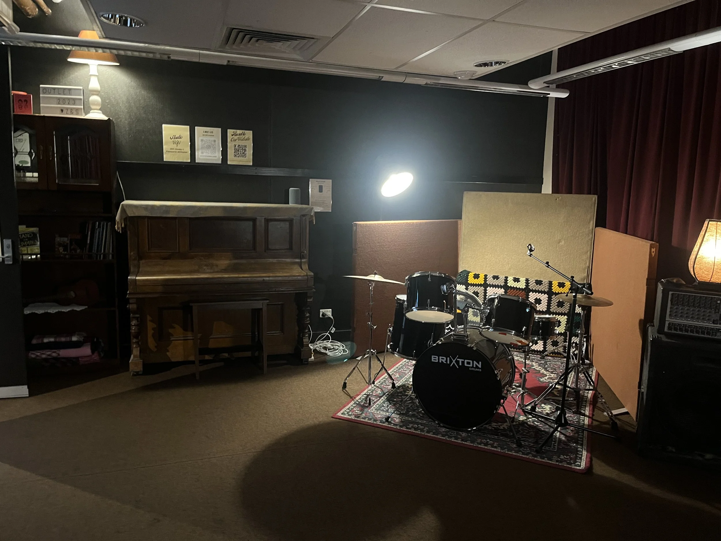 Bose Portable Speaker (vocals/acoustic guitar)Peavey PVi8B+PA SystemWertheim Upright PianoBrixton 5 piece drum kit with one cymbal standSpider Jam (very basic) Electric Guitar ampCob + Head 44 Magnum Power Electric Bass ampMicrophones and stands x2Mic, guitar and bass leadsMusic StandChairs, couch and writing toolsWifi, aircon, heating, tea and coffee supplies, mood lighting with Alexa, toilet and shower facilities, lift and loading dock.(As OUTLET continues to grow so will the equipment provided in the studio)